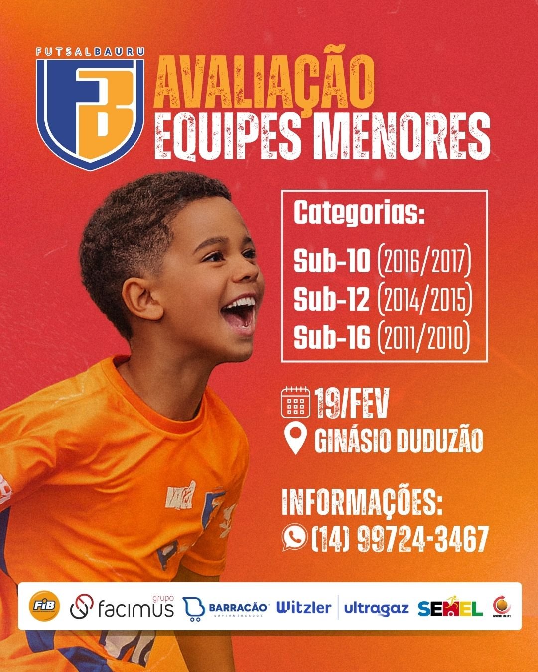 O Futsal Bauru FIB/Facimus irá fazer uma avaliação para três equipes menores. Os testes serão realizados nesta quinta-feira (19), a partir das 13h30, no Ginásio Duduzão, no campus das Faculdades Integradas de Bauru (FIB), e os interessados devem fazer a inscrição gratuita pelo formulário disponibilizado no Instagram @futsalbauru, que pode ser acessado pelo link: instagram.com/futsalbauru/.